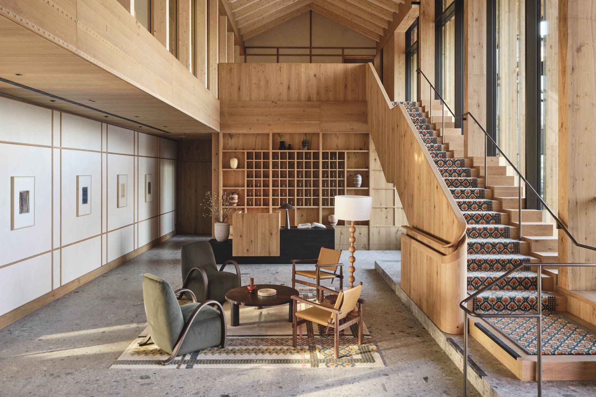 Blick in den zentralen Empfangsbereich: Die Treppe führt zu den Zimmern und Suiten. © Elias Hassos