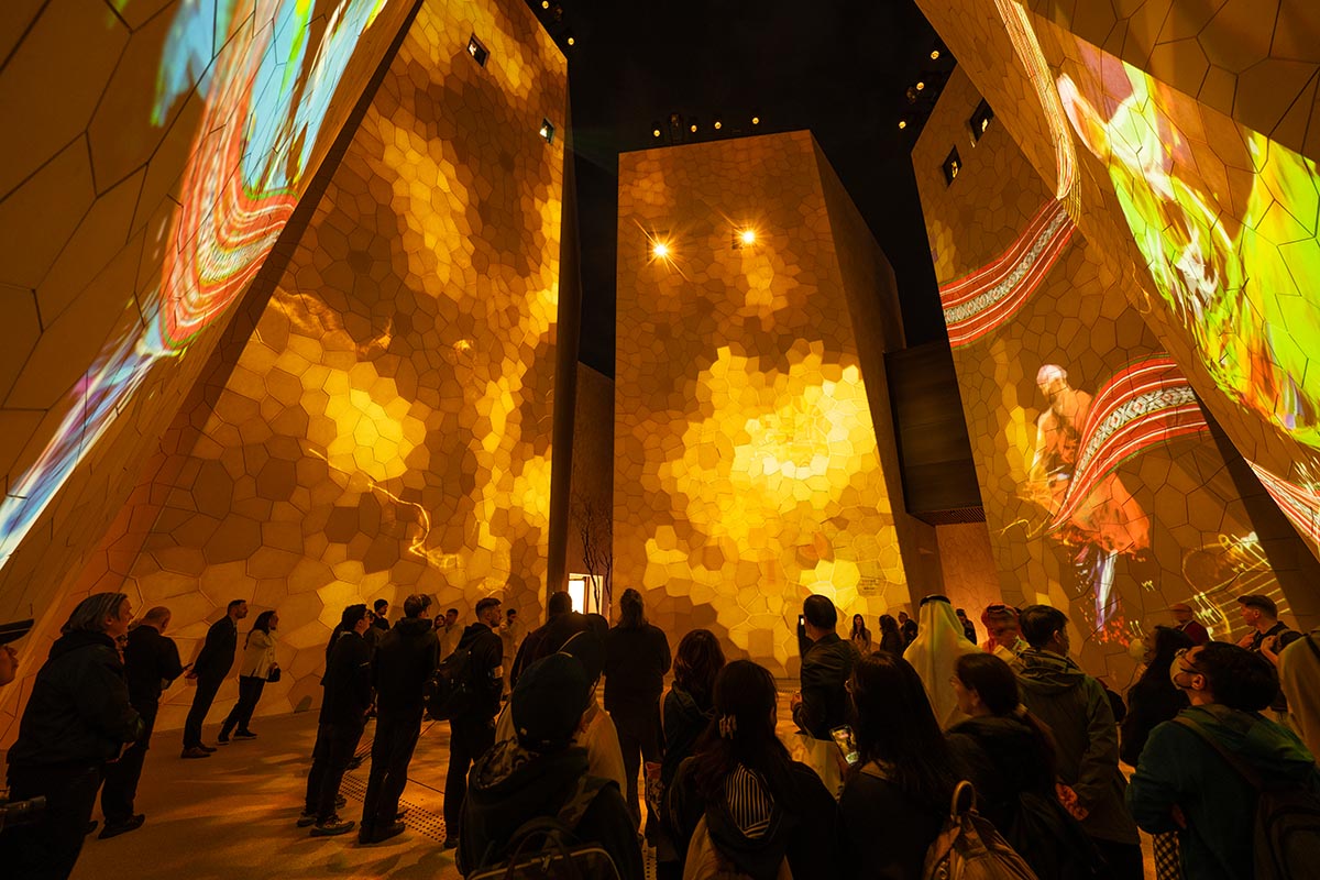 Der Saudi-Arabische Pavillon von Foster + Partners bietet eine multisensorische Reise durch das Königreich, von weiten Wüsten bis zu lebendigen Städten. Die Struktur aus leichtem saudi-arabischen Stein, inspiriert von traditionellen Dörfern, nutzt computergestützte Fluiddynamik für natürliche Kühlung und Belüftung. Nachhaltig gebaut mit niedrigem Kohlenstoffverbrauch, Photovoltaikanlagen und Regenwasserrückgewinnung, will der Pavillon sowohl technologische Innovationen als auch das kulturelle Erbe des Landes zeigen.